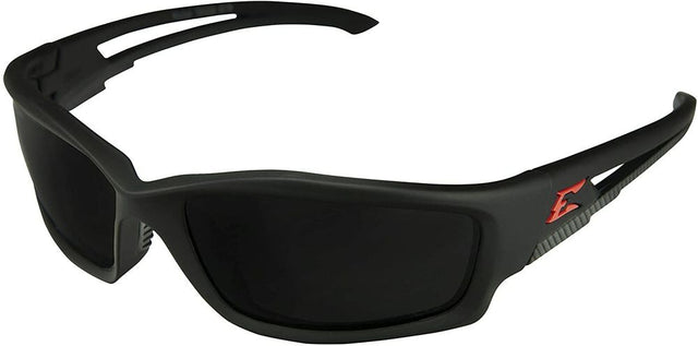 The aggressive Kazbek has a traditional rectangle frame that features jagged temple arms. Its flexible and durable matte black frame with a red "E" on each temple is equipped with soft thermoplastic rubber nose pads and Edge-Flex temple arms to create a comfortable, nonslip fit. This safety-rated eyewear has a rugged style and offers fashion and function in any situation. Polarized Smoke lenses provide the perfect all-around tint for bright light conditions.