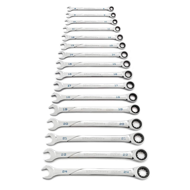 GEARWRENCH has redefined performance with the 120XP™ ratcheting wrenches, all of which have 120 unique ratcheting positions and a 3 degree swing arc. These ratcheting wrenches provide the best access possible and feature a tighter swing arc, a longer beam, a reduced diameter ratcheting box-end, and a slim line open-end design.