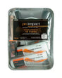 Pro-impact paint set. Handcrafted for all paints. For smooth and semi-smooth surfaces. Brush and rollers are durable and reusable. The set includes 9 inch metal roller tray, tray liner, 2 ea. Pro-impact roller covers, a 1-1/2 inch pro-impact angle sash brush and a heavy-duty roller frame.